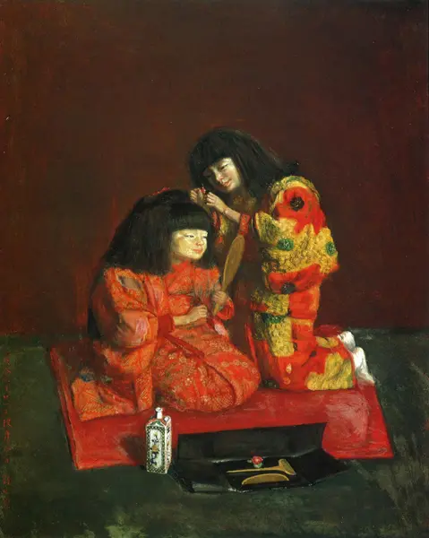 The character portrayed in all these variations is Kishida's daughter, Reiko. Every year from 1914 to 1929, on his daughter's birthday, Kishida would create a portrait of her. To be precise, the first painting in the series is not actually a portrait of Reiko; it is a painting of Kishida's wife, Shigeru, pregnant, depicted from the neck down, as if the main subject was the baby rather than the mother. These snapshots were not only a celebration of an anniversary: they allowed Reiko's father to fix an image, to challenge the passage of time. As if the little girl were in constant change and the artist sought to capture what remained constant, her essence. Almost always a bust from three-quarters, almost always dressed in red, almost always a realistic image of a child in a kimono. When the shot widens, Reiko is usually seated in the Japanese style, more rarely standing. However, some elements change constantly: Reiko might be holding a drum, a toy, an apple. In one version, she is smiling; in another, she looks troubled. But the variations on the theme don’t stop there. One of the most explicit transformations depicts the child as the Chinese poet Hanshan (寒山), in the style of 13th-14th century ink painting. In another painting, we see two nearly identical Reikos, one with more human features, who arranges the hair of the other, which resembles a puppet. Other representations are more fairy-tale-like and playful, showing her playing with a puppy, admiring flowers, or serving tea from a richly decorated teapot, often with an expression very distant from the realistic, sweet ones of the earlier works.